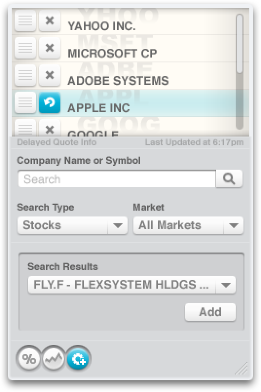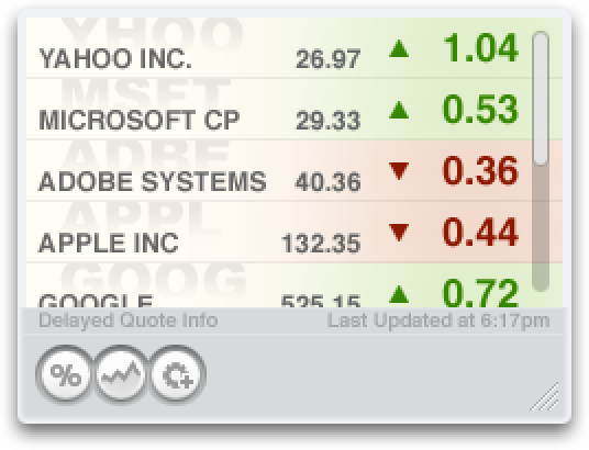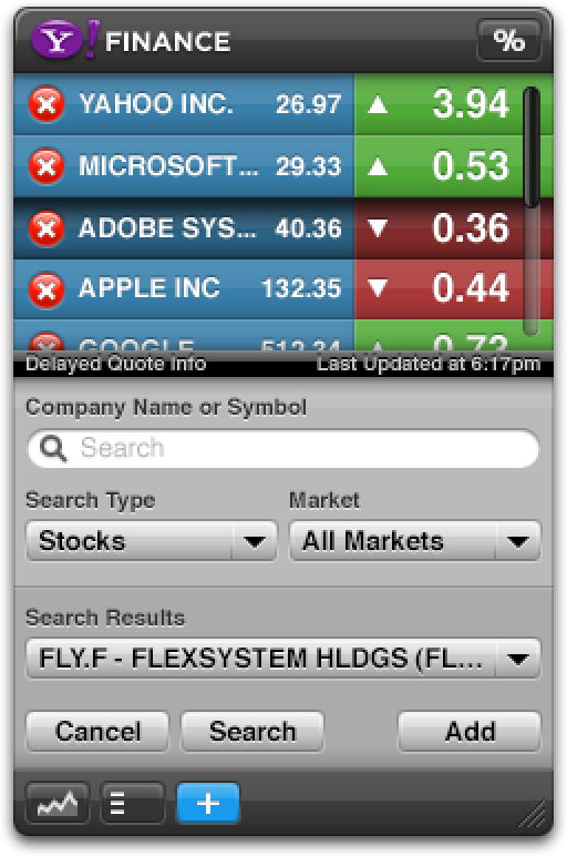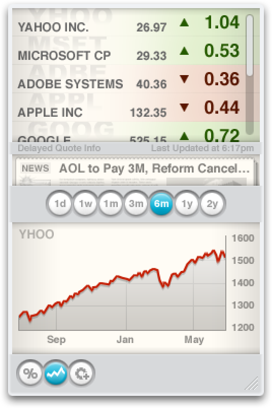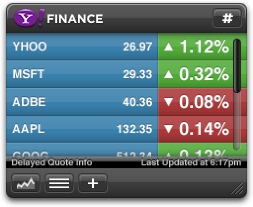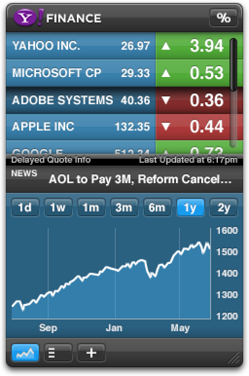The Yahoo Finance Widget provided a desktop view of selected stocks’ performance. It could be collapsed to only show current status, or expanded to show charts and a ticker of current, related news items.