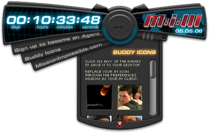 The Mission Impossible: III Widget was part of an advertising campaign to promote the movie. Taking the appearance of a physical device that would spin and expand open on the desktop, the Widget displayed a countdown to the movie’s release, a set of downloadable icons, and links to showtimes and additional movie info. After the release date, the Widget functioned as a stylish desktop clock.