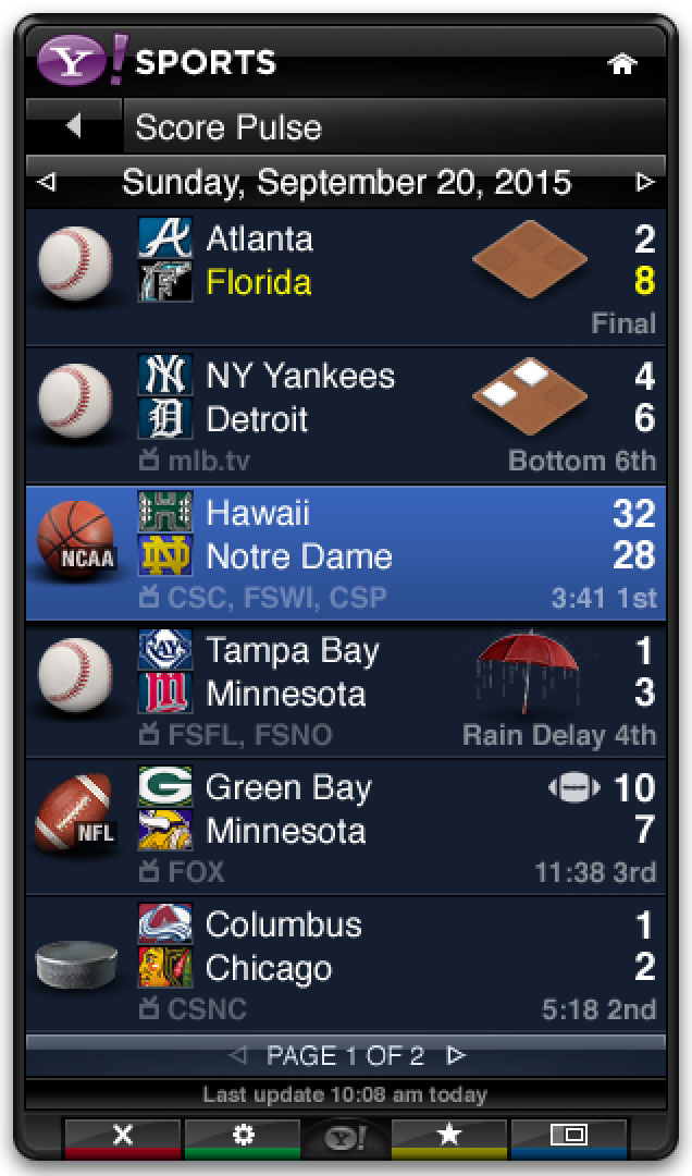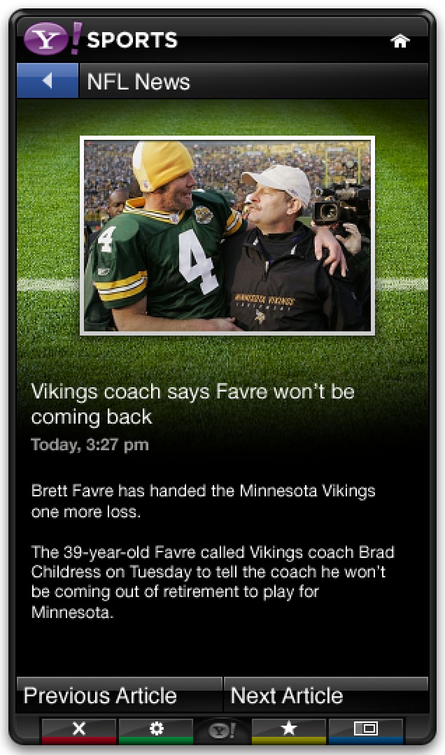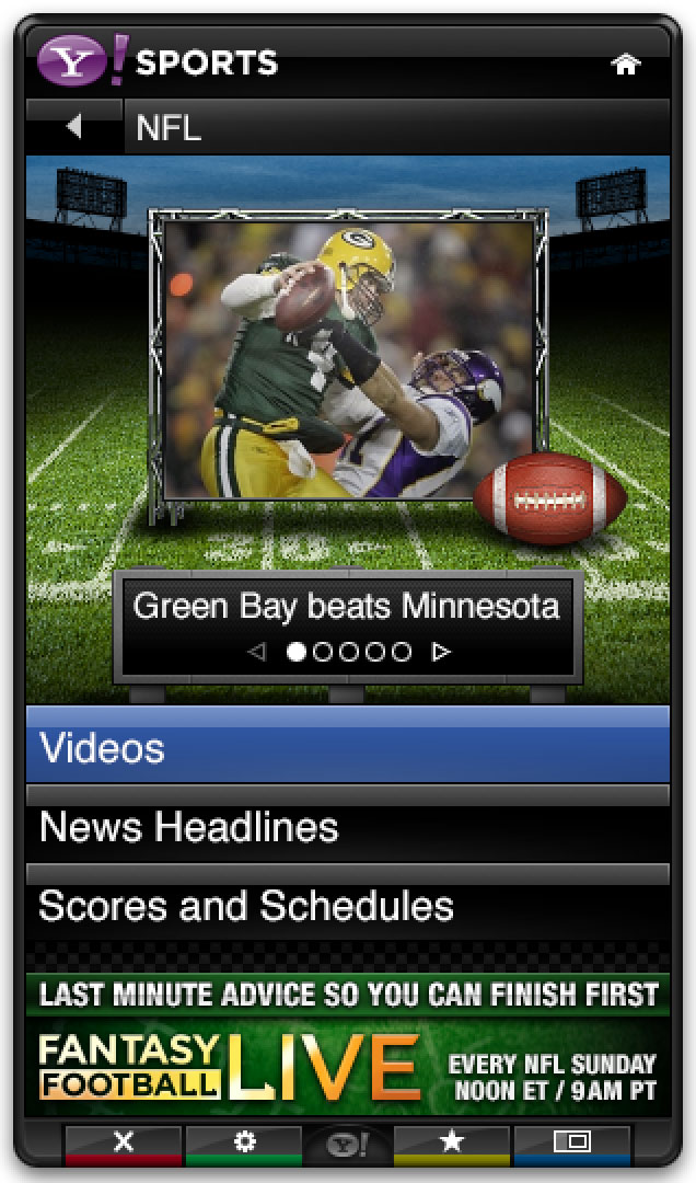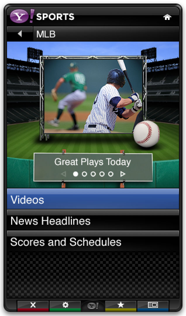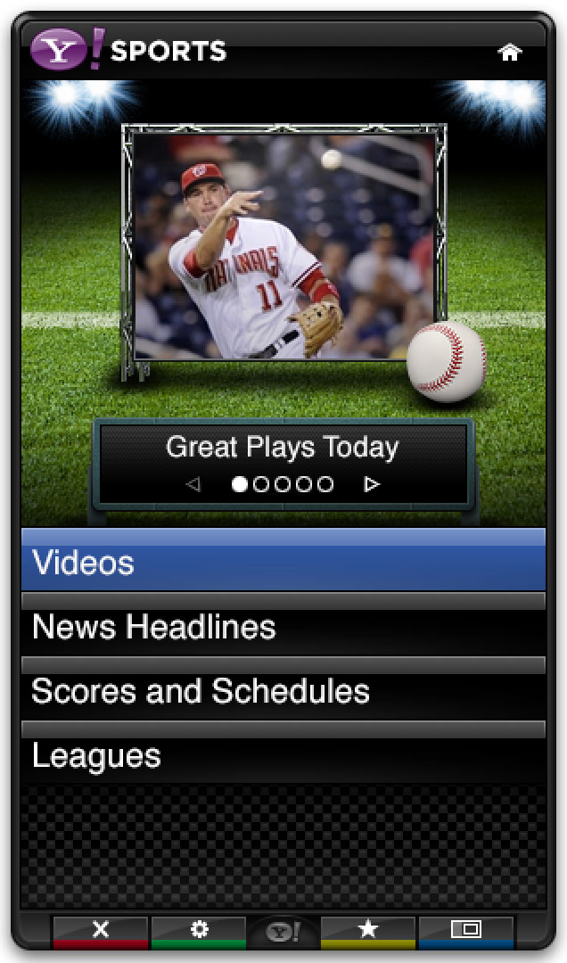 The Yahoo Sports app was part of the base install for the Yahoo Connected TV platform. It leveraged Yahoo’s extensive sports data to provide scores, news, and scheduling in a sidebar that could be opened alongside live games.
