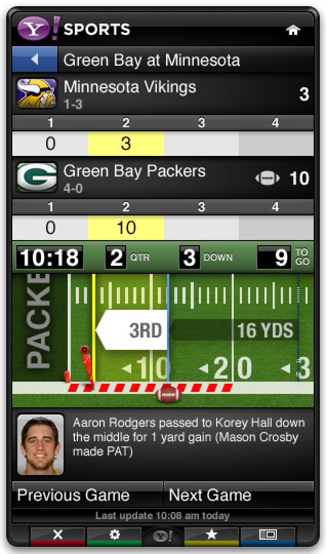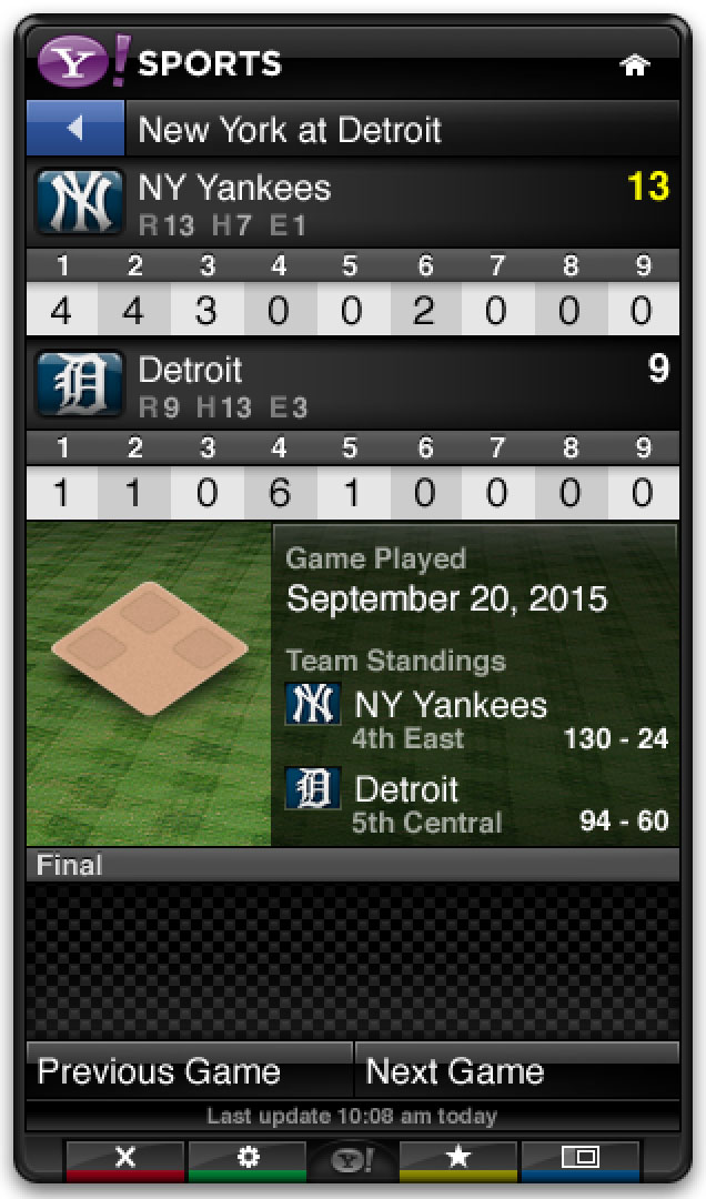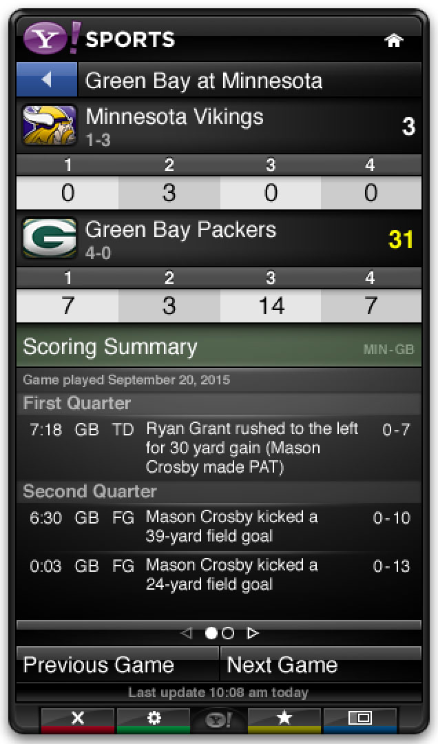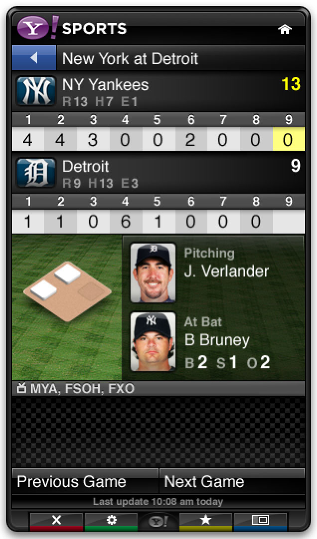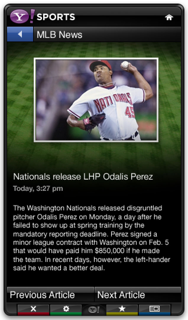 The Yahoo Sports app was part of the base install for the Yahoo Connected TV platform. It leveraged Yahoo’s extensive sports data to provide scores, news, and scheduling in a sidebar that could be opened alongside live games.
